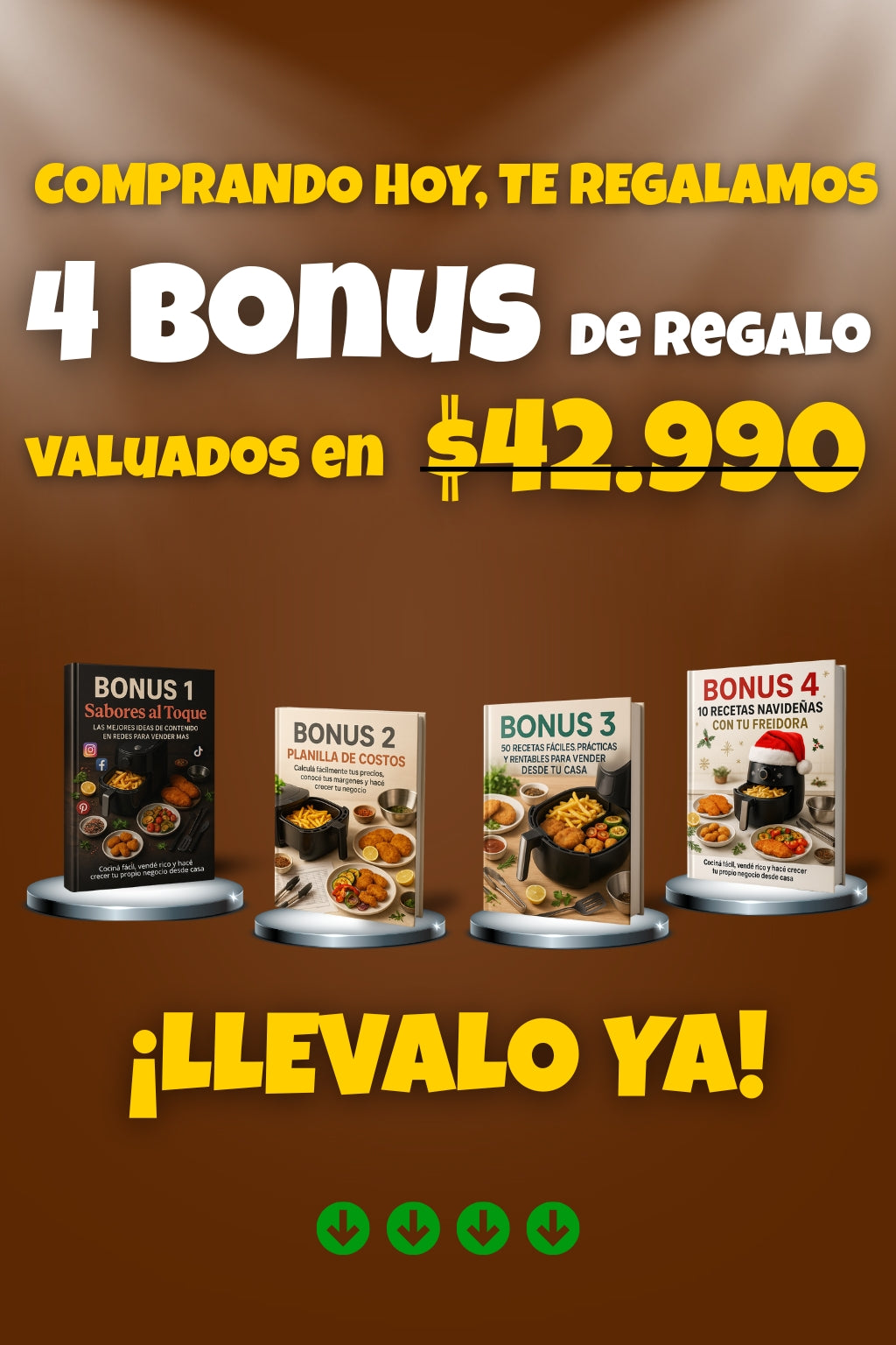 Incluyen un recetario con +50 recetas extra, ebook de ideas de contenido estratégico para redes sociales, ebook de plan de rentabilidad paso a paso y un ebook con 10 recetas navideñas con tu freidora de aire. Están pensados para acompañarte desde la cocina hasta la venta final.